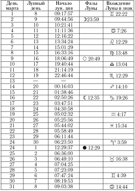 Любовь, семья. Если главное в вашей жизни – любовь, то можно смело рассчитывать на успех. После недоразумений, вполне вероятных в период с 1 по 10 марта и с которыми вы уже сталкивались во второй половине февраля, все входит в предсказуемую колею. Венера находится в вашем знаке с 5 марта и ее влияние усилится после 10 марта. Благодаря ей, во второй и третьей декадах месяца отношения с близкими заметно улучшатся и это в одинаковой степени касается и супругов, и влюбленных. Особенный успех ждет тех, кто связал свои личные интересы с человеком, проживающим в другом городе или другой стране. Именно в марте все может определиться окончательно – переезд и начало новой совместной жизни в краях, далеких от родины. Постарайтесь все сделать именно в этом месяце – впереди непростое время, когда неблагоприятных влияний будет значительно больше.