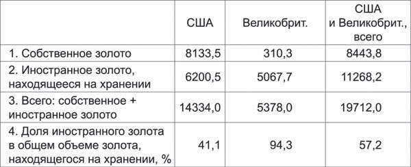 США и Великобритания в подвалах Федерального резервного банка Нью-Йорка и Банка Англии хранят иностранное золото в объеме, превышающем 11 тысяч тонн. Примечательно, что в Великобритании иностранного золота в 16 с лишним раз больше, чем собственного, а в США иностранное золото составляет 76 % по отношению к запасам собственного золота. В Банке Англии хранится золото из различных стран, входящих в Британское Содружество (Австралия, Канада, Индия и др.). Банк Англии сегодня играет большую роль не только для стран, входящих в БС, но также для стран континентальной Европы. Австрия, например, хранит в Банке Англии 80 % своего золотого запаса, Голландия — 18 %, Германия — 13 %. Имеются клиенты и из других регионов. Например, центральный банк Мексики хранит в Банке Англии 95 % золотого запаса. В Банке Англии размещают свое золото также организации, которые называются bullion banks (частные банки,