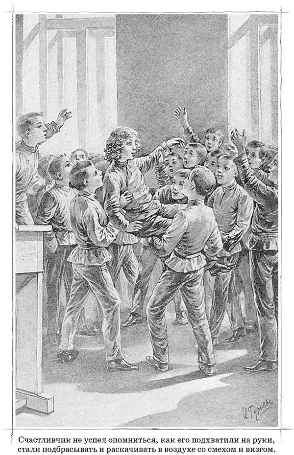 Десятка четыре рук, маленьких и средних, чистых и грязных, щедро отмеченных чернильными пятнами, потянулись к Счастливчик у. Его осторожно подбрасывали и раскачивали в воздухе и припевали со смехом и визгом: