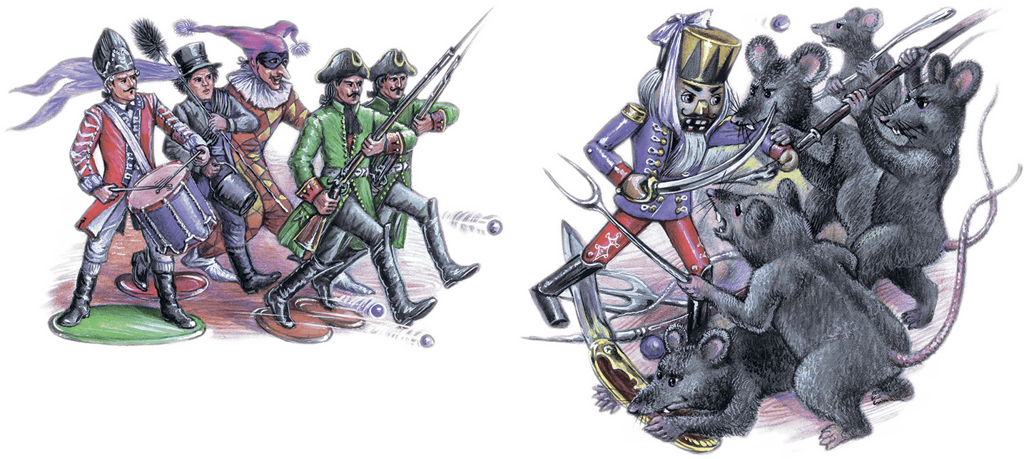 Грянула барабанная дробь. Разом распахнулись обе дверцы шкафа. Загремели сапоги, забряцали сабли, заржали лошадки, и ровными шеренгами выступили солдатики Фрица. Кирасиры сверкали своими доспехами. Драгуны гарцевали, сидя в высоких сёдлах. Блестящие гусары лихо пришпоривали коней. А за кавалерией катили пушки усачи пушкари. Один за другим промаршировали полки перед Щелкунчиком с развевающимися знамёнами и барабанным боем.