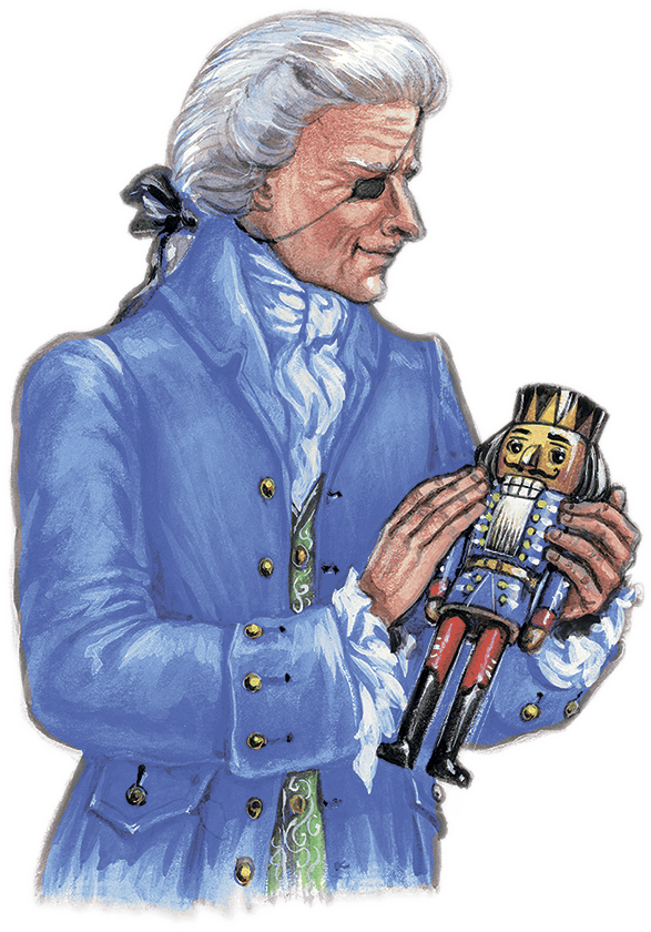 И он вынул из кармана Щелкунчика! Искусной рукой крёстный Дроссельмейер починил сломанную челюсть деревянного человечка и снова вставил три потерянных зуба.