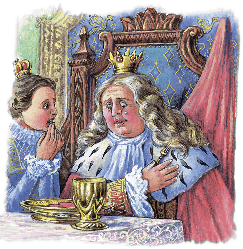 И грянул пир! Тру-ру-ру! – загудели трубы. Дум-дум-дум-м! – загремели литавры, созывая гостей. Король первым испробовал ещё тёплую, источающую чудесный запах свиную колбасу. Он положил на язык розовый ломтик, закатил глаза в предвкушении удовольствия и вдруг ахнул, откинулся на троне и горько зарыдал. Неужто заболел? Умирает? Послали за Придворным Лекарем. Но король слабо махнул рукой, открыл глаза и скорбно простонал: