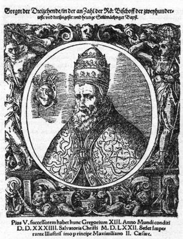 Рис. 2. Старинный портрет римского папы ГригорияXIII.Страсбург, якобы 1572 год. Дата подписана под портретом. Гравюра на дереве. Согласно музейной табличке, автор портрета — Тобиас Штиммер (1539, Шадгаузен — 1582, Страсбург).Портрет хранится в Государственном Эрмитаже в Санкт-Петербурге.