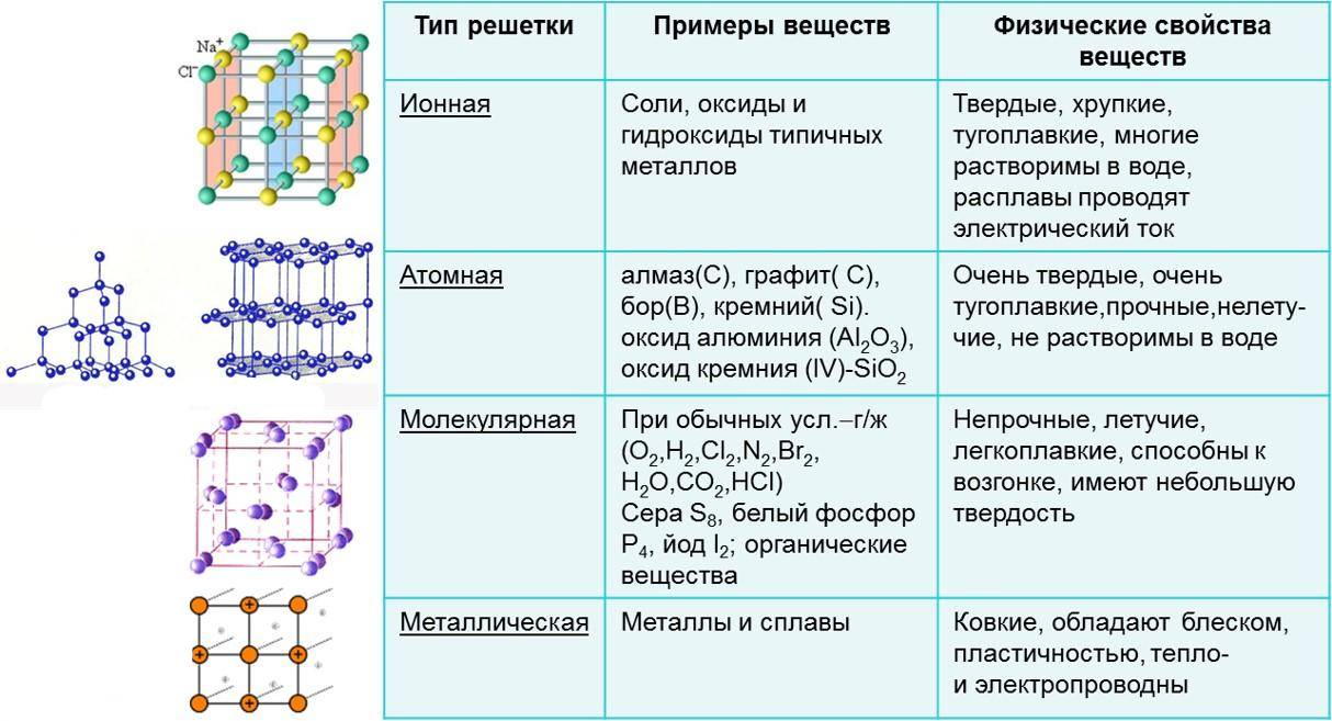Для выполнения этого задания вам потребуется знать типы химических связей и типы решеток.