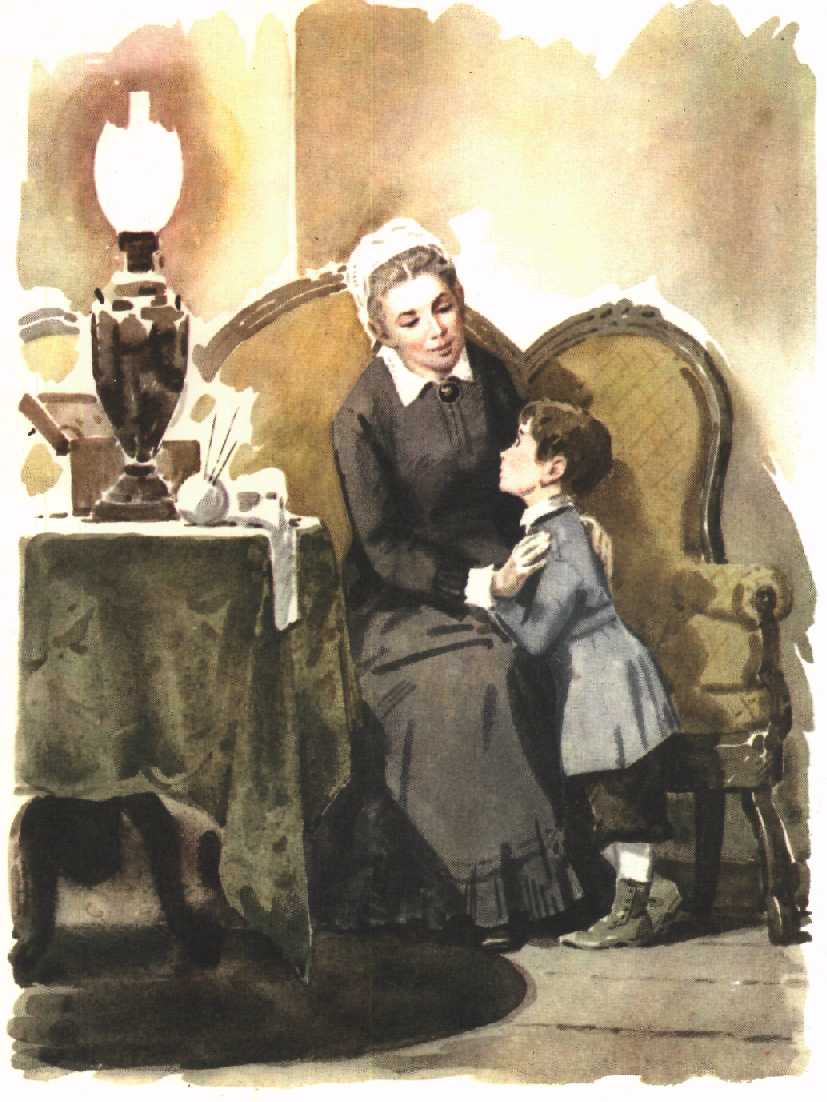 Митя, выпятив нижнюю губу, несёт на ладонях конверт, разрисованный диковинными цветами и неведомыми зверюшками. Все самые яркие и весёлые краски и всё своё умение вложил Митя в рисунок. А как старательно выведены на листке четыре слова: «Дорогая мамочка. Поздравляю! Митя».