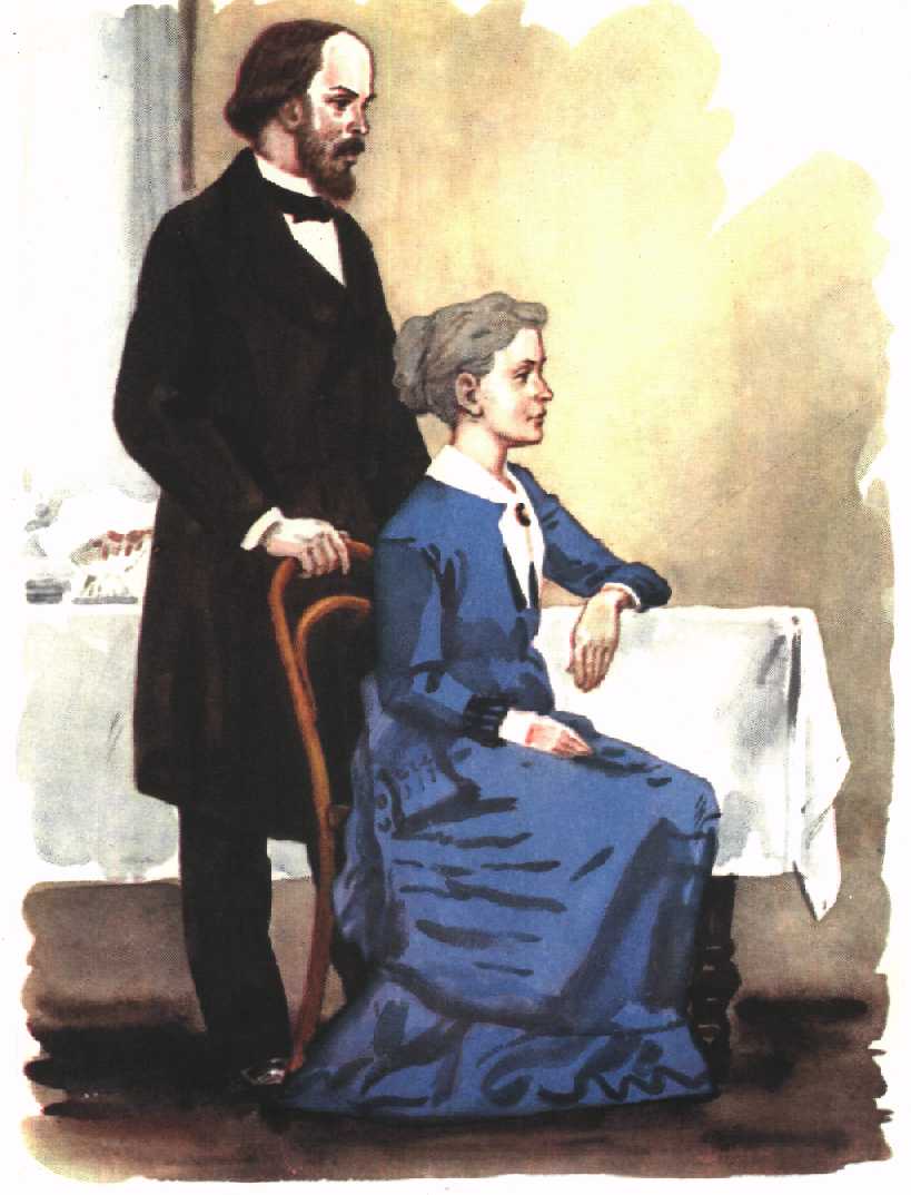 Вошли в комнату, остановились. Шесть пар сверкающих глаз с восхищением смотрят на свою маму. Она сегодня такая красивая! Ей так идут синее платье с белым воротничком и волосы белые, как кружево, над высоким лбом! Добрые губы улыбаются, и в карих глазах поблёскивают солнечные искры. Папа в парадном сюртуке стоит за стулом мамы, сияющий, торжественный.