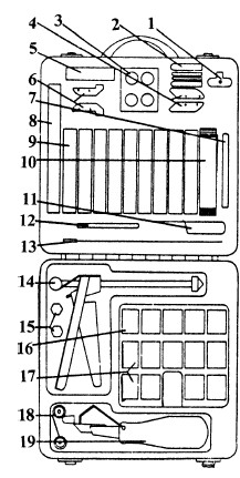 Рис. 27. Комплектация инсталляционного набора: 1 — захват для замены резцов; 2 — крепёжные элементы — лепестки (для широких трещин); 3 — высококачественная глина; 4 — резцы для установки толстой проволоки; 5 — х — образный резец; 6 — резцы для установки тонкой проволоки; 7 — точильный камень; 8 — х — образный нож; 9 — девять тюбиков с разноцветной пастой (для закрепления и маскировки); 10 — ствол для «пастного пистолета» (рассчитан на один тюбик пасты); 11 — клинок для очистки проволоки; 12 — нейлоновая палочка для манипуляции проволокой и пастой; 13 — спица для ввода очень тонкой проволоки в резец; 14 — «пастный пистолет» для закрепления проволоки и её маскировки; 15 — ластик для очистки резцов; 16 — пять катушек двух жильной проволоки марки # 30; 17 — девять катушек трёхжильной проволоки марки # 38; 18 — две насадки для ствола «пастного пистолета»; 19 — устройство с электронным контролем для принудительной установки проволоки (вмещает одну катушку)