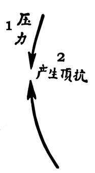 Если во время занятий руки прямо вытягивают и прямо подбирают и не вращают ладонями, а ноги сгибают лунообразно вперед и садятся, но без сочетания с вращением влево или вправо, то может возникнуть такой недостаток, как «подпор и упирание» двух соревнующихся сил (см. рис. 2). Чтобы избавиться от этого недостатка, нужно использовать вращательное усилие. Поскольку радиус вращения меняется, то любое давление передается на ось вращения, а при вращении очень легко может быть опущено в пустоту и преобразовано. Это метод научного преобразования усилия-цзинь. Указанное действие хорошо видно на рис. 3.