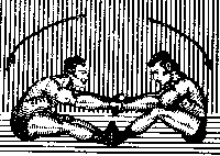 6. Упражнение для двоих. Лягте на спину головами в разные стороны, плотно прижмитесь друг к другу и обхватитесь согнутыми в локтях руками. Поднимите ноги, как показано на рисунке, зацепитесь ими на уровне нижней части голени и, нажимая на ногу партнера, старайтесь прижать ногу партнера к полу