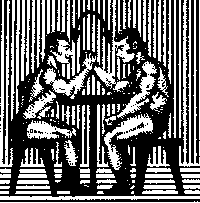 9. Сядьте за стол напротив друг друга, как показано на рисунке. Согните правую руку под прямым углом и обопритесь локтем о стол. Сжав ладонь партнера, попробуйте прижать его руку к столу тыльной стороной кисти, не сдвигая с места локтя и не меняя положение корпуса.