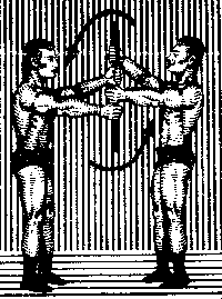 11. Встаньте лицом друг к другу, держа прямыми руками перед грудью палку в вертикальном положении. Правая рука должна обхватывать палку на уровне лица, а левая — на уровне пояса. Теперь, преодолевая сопротивление партнера, не сгибая рук, перевести палку в горизонтальное положение, вращая ее по часовой стрелке.