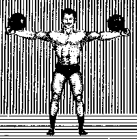 Поставьте ноги на ширину плеч, гири поднимите к плечам, а затем вверх. Медленно опустите прямые руки в стороны, до горизонтального положения так, чтобы гири лежали сверху на предплечьях. Через две-три секунды снова поднимите руки и опустите к плечам. По мере тренированности пробуйте удерживать гири за дужку сверху.Этот силовой трюк пользовался особой популярностью среди атлетов прошлого. Знаменитый русский атлет Сергей Елисеев брал в правую руку гирю весом в 61 кг, поднимал ее вверх, затем медленно опускал на прямой руке в сторону и несколько секунд удерживал руку с гирей в горизонтальном положении. Георг Гаккеншмидт («Русский лев»), подняв вверх двухпудовые гири, медленно опускал прямые руки в стороны до горизонтального положения, держа гири дном вниз. Затем поднимал руки вверх и снова опускал в стороны. И так пять раз.