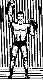 7. «Мельница»— попеременное выжимание. Поднимите гири к плечам, ноги поставьте на ширину плеч. Попеременно выжимайте гири вверх: одна рука разгибается, другая сгибается. Ноги — прямые. Для облегчения первое время можно отклонять туловище в сторону руки, опускающей гирю. По мере тренированности выполняйте упражнение, уже не отклоняясь.