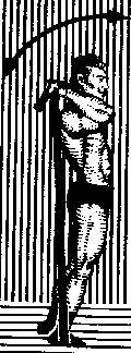 3. Поставьте ноги на ширину плеч, наступив на середину резинового бинта. Наклоните туловище вперед, концы бинтов возьмите в руки и удерживайте их на затылке. Выпрямите туловище — вдох, затем вернитесь в исходное положение — выдох.