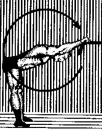 6. Закрепите середину резинового бинта перед собой на уровне пояса, возьмите концы бинтов в руки, наклоните туловище вперед и вытяните руки вперед. Проделайте прямыми руками одновременные круговые движения вперед, как при способе плавания «дельфин». Дыхание не задерживайте. Поднимая руки, делайте вдох, а опуская — выдох.