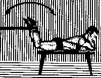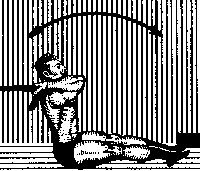 8. Лягте на спину, носки ног закрепите за неподвижную опору, середину бинта прикрепите за головой и, взявшись за его концы, согните руки к плечам. Не сгибая ног в коленях, поднимите туловище до положения сидя, затем плавно вернитесь в исходное положение. В исходном положении делайте вдох, поднимая туловище — выдох.