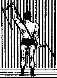 7. Закрепите середину резинового бинта на потолке, поднимите руки вверх и возьмитесь за концы бинтов так, чтобы они были в натянутом положении. Не сгибая рук в локтях, опустите их через стороны вниз до касания бедер, затем медленно поднимите в исходное положение. Опуская руки вниз, делайте выдох, поднимая вверх — вдох.