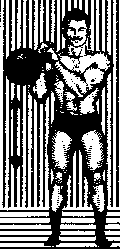 2. Поставьте гирю перед собой на пол. Наклонитесь вперед и обхватите правой рукой ручку гири снизу, а левой — сверху. Выпрямляя туловище, поднимите гирю к правому плечу так, чтобы гиря была с наружной стороны предплечья, а локоть опущен вниз — вдох. Зафиксировав принятое положение, опустите гирю в исходное положение — выдох. Затем проделайте упражнение левой рукой. По мере тренированности подъем гири к плечу выполняйте одной рукой.