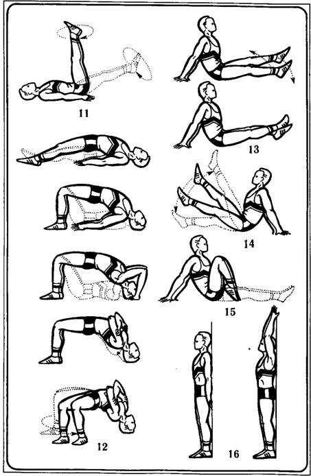 После отдыха — очень сложное упражнение. Я все еще лежу. Опираясь затылком и пятками о пол, стараюсь приподнять туловище. Руки ладонями вниз вытянуты вдоль тела. Это же упражнение усложняю — сгибаю ноги в коленях. Теперь можно приподняться выше. 8-10 повторений. Меняю положение рук. Ладони опираются о пол около головы. Приподнимаюсь еще выше. Встаю почти на «мост». И, наконец (но это уже только для подготовленных людей), стоя на «мосту», руки на груди — сгибание и разгибание шеи, переступаю ногами вправо, затем влево (рис. 12)…