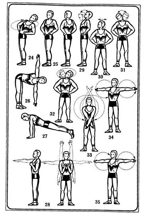 — Помните, я говорил о том, что мои суставы за последнее время стали подвижнее?.. Так вот, в 70 лет я мог достать до стены, отойдя не более чем на метр… Впрочем, двинемся дальше: наклоны вперед. Восемнадцатое упражнение.