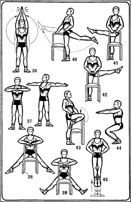 38-е упражнение — для голеностопных суставов. Я держусь рукой за спинку стула и приподнимаюсь на носках, постепенно разводя их все шире и шире, затем свожу, начиная разводить пятки. Опять-таки удерживаясь за стул, махи ногами вперед-назад. Стоя лицом к стулу, скрестные махи. Отведения ног в стороны. Вот хорошее упражнение: я сгибаю ногу в колене и описываю коленом круги. Наконец, приседания и подскоки (рис. 38–45). Все. 45 упражнений позади. Гимнастика окончена. Теперь душ — и за работу…