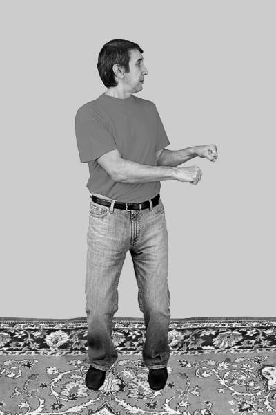 Колени выпрямились – выдох пассивно уходит при их выпрямлении. Повернулись влево, слегка присели, кистями рук сделали легкое хватательное движение – вдох. Сразу же после этого колени выпрямились, воздух ушел абсолютно пассивно при их выпрямлении.