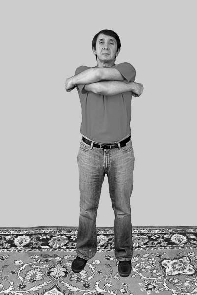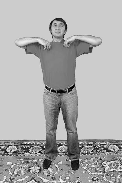 Итак: наклон к полу, руки к коленям – вдох, затем легкий прогиб в пояснице назад – встречное движение рук со слегка откинутой назад головой (тоже вдох).Тик-так, вдох с пола, вдох с потолка. Это упражнение напоминает маятник, оно комплексное, состоит из двух простых: «Насоса» и «Обними плечи». Сильно в пояснице не прогибайтесь, когда откидываетесь назад, и не напрягайтесь: все делается легко и просто, без лишних усилий.