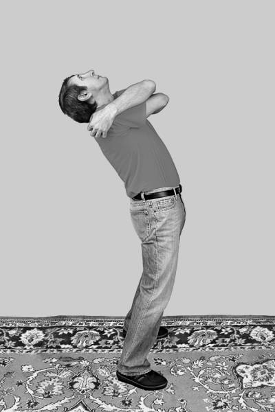 Исходное положение: встаньте прямо. Слегка наклонитесь к полу (руки тянутся к коленям, но не опускаются ниже их) – вдох. И сразу же без остановки слегка откиньтесь назад (чуть прогнувшись в пояснице), обнимая себя за плечи, – тоже вдох. Выдох уходит пассивно между двумя вдохами-движениями.