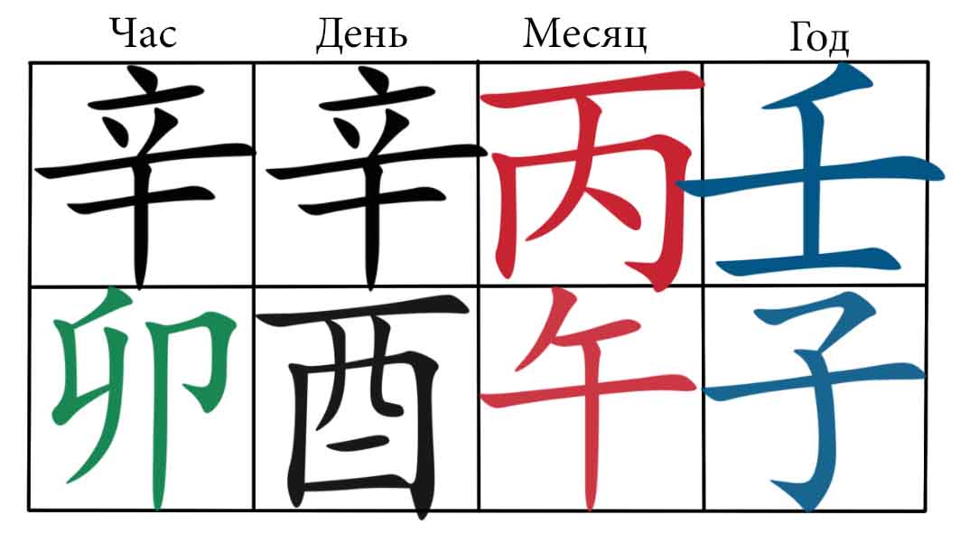 Дд иньского Металла использует янский огонь как ПЧ, сама ДД сидит на ветви Петуха (Ю) , получает исключительное Служебное благополучие и сама процветает. В Часе вытягивается столп Иньского Металла на Кролике (Мао) как Металл. Другой (то есть дубликат ДД в Часе) отходит бессильный, поэтому сам ДД прямой, а тот другой – Косой. Здесь две женщины борются, соперничая за мужчину, Прямой и Косой ищут свое место.