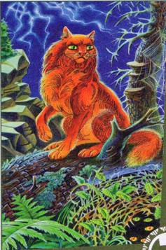 На вершине высокой скалы появилась полосатая кошка из числа тех, кто пал в ночной битве. Весь лес тонул во тьме, и лишь ее шерсть сверкала ослепительным блеском. Глаза кошки метали яростные молнии.
