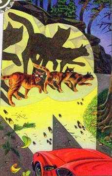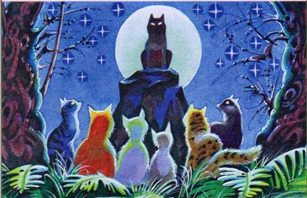 Однажды ночью, когда в высоте небес светила полная луна, коты собрались на лесной поляне, где росли четыре могучих дуба. И снова среди них вспыхнул спор из-за дичи. Блеснули выпущенные когти, грозные вопли сотрясли лес. Началась страшная битва, и земля стала скользкой от пролитой крови.