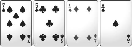 Старшая карта (семерка) выходит из комбинации, и образуется ряд 5, 4, А, X. Такая рука проигрывает любой комбинации бадуги и называется «три карты из четырех» (three card four). Естественно, чем меньше образовавшаяся комбинация, тем лучше. Все трехкарточные комбинации выигрывают у двухкарточных. Пример руки из двух карт: