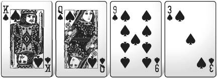 Три высшие по рангу карты не принимаются во внимание, а остается тройка пик – выигрышная односоставная комбинация.
