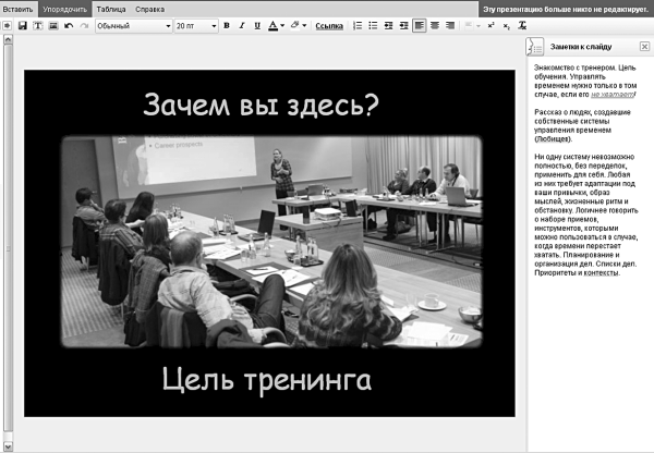 Во время работы над презентацией бывает полезно снабдить слайды дополнительной информацией, которую докладчик может просмотреть перед выступлением. По умолчанию она не видна в стандартном слайд-шоу, но всегда доступна в режиме редактирования. В заметках полезно размещать и дополнительную информацию, которая будет полезна людям, решившим самостоятельно пролистать вашу презентацию. (Сразу о нескольких способах публикации презентаций будет рассказано чуть позже.)