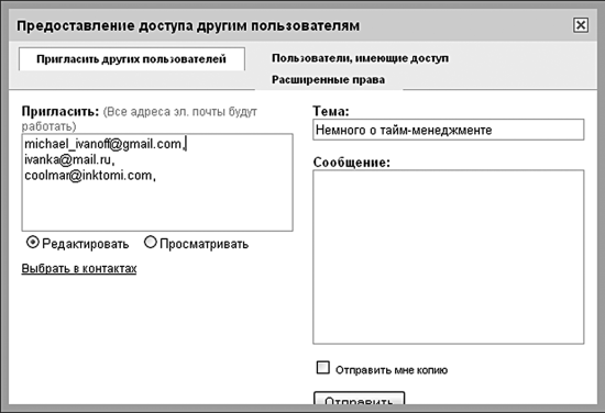 В появившемся окне необходимо решить вопрос о статусе приглашаемых – будут ли они зрителями презентации или ее полноправными соавторами. После этого в текстовом поле вводятся адреса предполагаемых участников, при этом можно воспользоваться и собственной адресной книгой. Дополнительные разрешения, как и в случае с Таблицами Google, определяют уровень полномочий: сможете ли вы приглашать к работе над презентацией других людей, а также можно ли будет делиться ссылкой на открытых