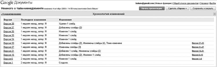 форумах. (Напомню, что если флажок «Приглашения может использовать кто угодно» отключен, то отправляемая пользователям ссылка становится именной, и воспользоваться ею смогут только те, кого вы лично пригласили к работе или просмотру.) После ввода адресов приглашенных и установки дополнительных параметров нажимаем кнопку «Пригласить соавторов» или «Пригласить читателей» – на их адрес будет отправлено письмо с радостной новостью о начале совместной работы, а их имена появятся в вашем списке соавторов и читателей. После этого можно спокойно возвращаться к работе над презентацией с помощью ссылки «Вернуться к редактированию». О том, что к работе над вашим детищем присоединился тот или иной человек, вы узнаете по всплывающей подсказке с его именем в правом нижнем углу экрана. При этом общаться с коллегами удобно с помощью специального чата – полного аналога чата в Таблицах.О том, как проходила работа над созданием презентации, всегда можно узнать с помощью механизма версий. Команда «Файл – Просмотреть историю изменений» выведет на экран хронологию изменений с возможностью перехода к любой версии (рис. 4.15).