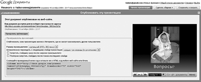Рисунок 4.16. Ссылку на опубликованную презентацию можно послать друзьям и коллегам, а саму презентацию с гордостью добавить на страницу собственного сайта. (Кстати, если у вас все еще нет сайта – дождитесь главы 9!)