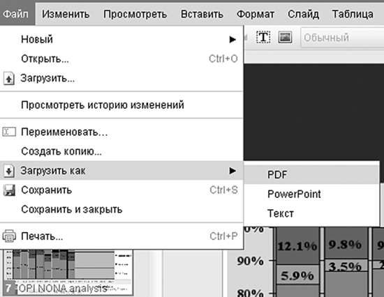 На данный момент автономная работа над презентациями недоступна, поскольку технология Gears сервисом пока (но только пока!) не поддерживается. А жаль – опция показа слайдов ой как пригодилась бы, к примеру, менеджерам по продажам, отправляющимся в далекий поселок нефтяников. Ведь Интернет там вряд ли станет доступен раньше чем через несколько десятилетий! Впрочем, не стоит унывать. На этот случай в нашем распоряжении всегда есть возможность экспорта в один из общепринятых форматов – ppt (MS PowerPoint), txt, а также pdf. Стоит заметить, что файл формата pdf при прочих равных условиях имеет наименьший размер, а поэтому именно в него стоит конвертировать презентацию, если вопрос об объеме файла стоит особенно остро (например, в случае пересылки его по почте). Для экспорта файлов выберите пункт меню «Файл – Загрузить презентацию как», после чего документ выбранного формата будет скачан на ваш компьютер (рис. 4.17).