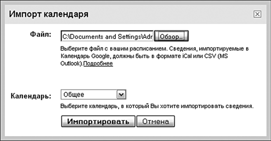 Наконец, последняя возможность импорта календаря – из файла. Файл формата iCal можно получить путем экспорта практически из любого современного календарного менеджера, будь то Microsoft Outlook или Mozilla Sunbird. Именно поэтому импортом файлов можно с легкостью решить проблему миграции с обычных «десктопных» календарей на их более продвинутый онлайновый аналог. Просто выберите необходимый файл, укажите, в какой календарь следует добавить информацию, и нажмите кнопку «Импортировать» (рис. 5.15).