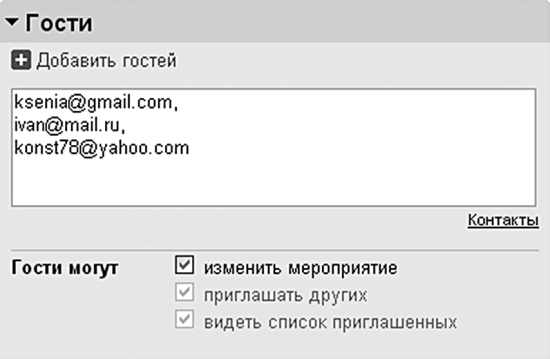 Если среди ваших знакомых есть люди, тоже пользующиеся календарями, то организация встреч с ними теперь превратится в чрезвычайно удобное и простое действо. Если в мероприятии планируется участие нескольких пользователей Календаря Google, то вместо их обзвона или оживленной переписки с ними по ICQ гораздо приятнее будет воспользоваться возможностью рассылки приглашений. Создавая мероприятие, обратите внимание на раздел «Гости» в правой части экрана. В текстовом поле через запятую можно указать электронные адреса всех участников игры в поддавки или товарищеского чемпионата по пейнтболу (рис. 5.16). (Поразительно, как подобного рода невинные приятельские соревнования, скажем, между отделом продаж и отделом технической поддержки превращаются в неистовую рубку с привлечением тяжелой артиллерии и стратегических бомбардировщиков!)