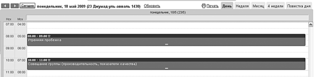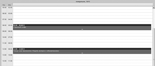 После начала работы с Календарем Google самое время обратиться к его тонким настройкам. Если вы постоянно мотаетесь между Владивостоком и Питером, то уже давно привыкли считать время в двух часовых поясах: «Так, у нас три часа дня, значит, в Питере уже восемь утра. Доброе утро, любимая!» Чтобы быть в курсе времени дополнительных часовых поясов, на закладке «Общие» нажмите на ссылку «Показывать дополнительный часовой пояс», выберите необходимый вам из списка и укажите метку, по которому будете его узнавать: «Дом», «Актюбинск» или «США» как раз подойдут. После этого на шкале времени кроме базового часового пояса будет отображаться еще и дополнительный (рис. 5.17).
