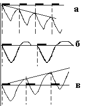 Рис.3. Суперкомпенсация. а) - разрушение /расходование во время тренировки, б) - восстановление, в) - сверхвосстановление,