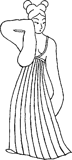 Следует отметить, что шея у женщин оставалась открытой и нередко значительная часть груди была обнажена. В первую очередь это относится к танцовщицам. Судя по погребальным статуэткам, они были облачены только в тонкое платье с декольте. Под грудью оно было перехвачено лентой и дальше ниспадало широкой гофрированной юбкой. Рукава были необычайно длинными, и размахивание ими играло важную роль во время танцев, о чем имеются многочисленные упоминания в прозе и поэзии. На рис. 7 изображена танцовщица с полуобнаженной грудью. Однако, судя по другим погребальным статуэткам, девушки часто танцевали, полностью обнажив грудь. При династии Тан китайцы совершенно спокойно относились к тому, что женщины обнажали шею или грудь. Но начиная с династии Сун грудь и шею стали скрывать складками платья, а потом под высоким, плотно прилегающим воротником нижней куртки. Высокий воротник и по сей день остается отличительной чертой одеяния китайских женщин.