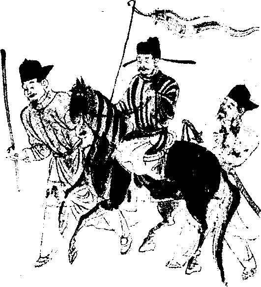 На рис. 8, японской копии танского свитка, изображающего десять царей Ада, мы видим судью верхом на коне в сопровождении двух помощников. На голове у него судейская шапка с жесткими крыльями. Верхнее платье плотно запахнуто, но на шее можно видеть и выглядывающее из-под него нижнее платье более светлого цвета. Судя по изображениям чиновников в Дуньхуане, более светлое нижнее платье всегда проглядывает сквозь разрез верхнего официального платья. Особо отметим широкие шаровары, свисающие над стременами. Помощники судьи одеты в более короткие куртки и обуты в соломенные сандалии. Один из них держит скипетр, а другой — меч судьи.