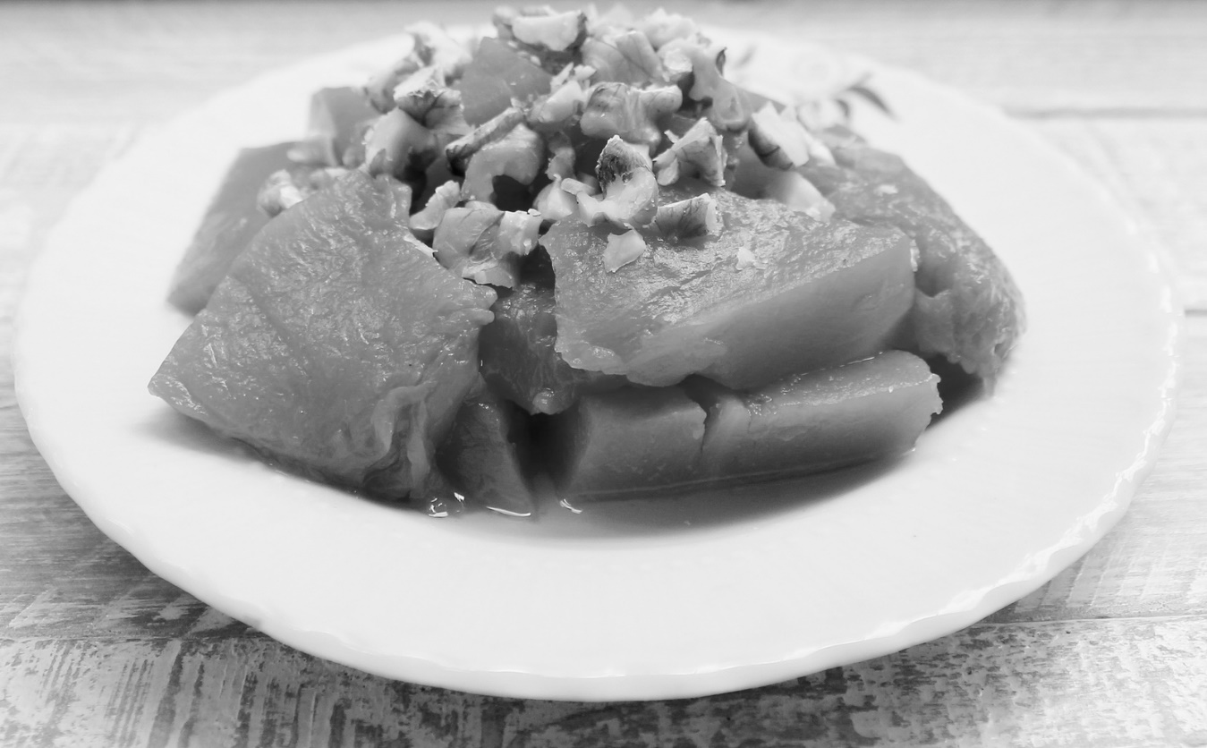 Режется тыквенная мякоть крупными кусками, засыпается сахаром, стоит пару часов, пускает сок. Потом в этом соке-сиропе тыква варится, остужается, засыпается щедро крупномолотыми грецкими орехами. Вся фишка – в них. С орехами вкусно. Без орехов – банальная тыква в сахарном сиропе.