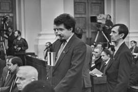 С. Н. Бабурин: Из шести человек четверо принадлежали к Российскому Общенародному Союзу. Это мы с Павловым и Исаковым, потом в РОС вступил еще и Константинов, как в движение. А двое были беспартийными, они входили во фракцию «Смена — новая политика». Когда я выступал, я зачитал первый исторический документ Российского Общенародного Союза против Беловежских соглашений, где мы назвали их «Брестским миром 1991 года». Но было горько, и я понимал, что, к сожалению, мы не можем убедить большинство. И когда после обсуждения состоялось голосование, зал стоя рукоплескал итогам голосования. Не разрушению Советского Союза, — я подозреваю, что они гнали от себя эту мысль, — они приветствовали создание СНГ. Я в тот момент шел от трибуны к своему месту, и у меня, как сейчас помню, даже выступили слезы на глазах оттого, что происходит. Я готов был сесть в знак протеста прямо в проходе, чтобы не оказаться среди этой стоящей толпы. Настолько всё это было кошмарно. Верховный Совет понял, что он учудил, уже через полгода. Многие раскаивались, и сегодня со стыдом не хотят вспоминать своего голосования. Ну, из песни слова не выкинешь.