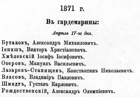 Сразу следует заметить, что среди выпускников МКК 1871 года нет «военно-морских звезд первой величины», чьи барельефы украшают мраморные стены вестибюля станции метро «Адмиралтейская» [11] в Санкт-Петербурге или чьи бюсты «бронзовеют» на аллее героев российского флота в музейно-историческом парке на острове Кронштадт [12] .
