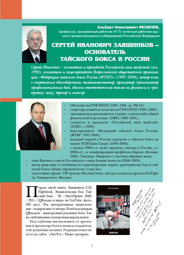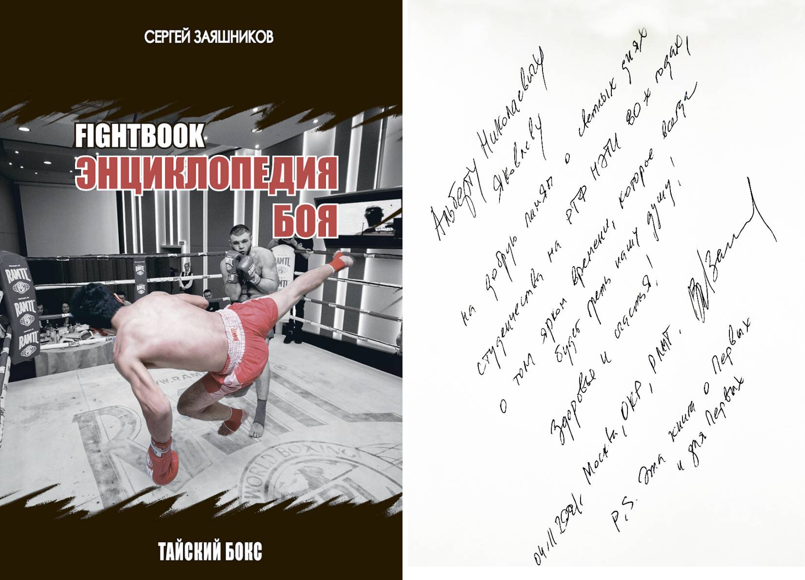 Передо мной его книга «Заяшников С.И. Fightbook. Энциклопедия боя. Тайский бокс. – М.: Изд-во «ОнтоПринт», 2020. – 232 с. QR-коды и видео на YoyTube, фото, 500 экз.». Эта интерактивная энциклопедия подарок мне от автора. В ней под каждым QR-кодом видеоролики реальных боев. Также опубликована электронная версия книги.
