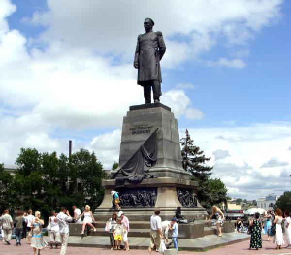 Его лик обращён в сторону города-героя, а у первого памятника адмиралу фигура была обращена в сторону Большого рейда (Севастопольская бухта) – он встречал корабли, приходящие из походов (памятник открыт в 1898 году, уничтожен в 1928 году).