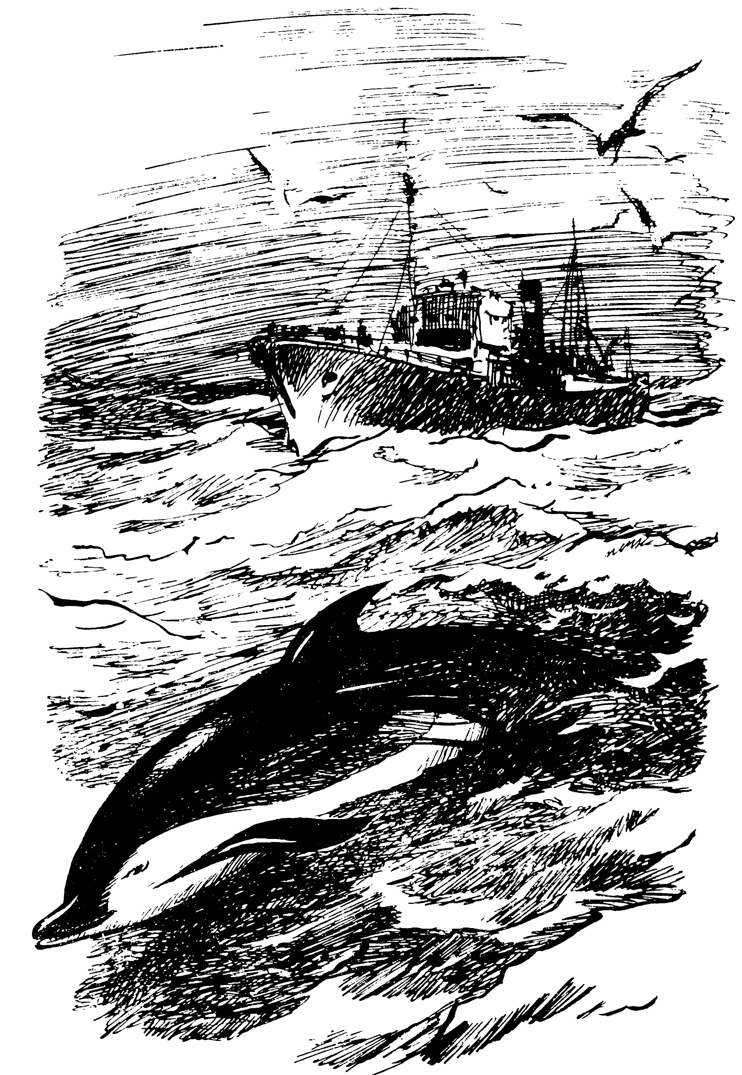 Зверь то ходил большими кругами вокруг корабля, то подныривал под судно, чтобы появиться с противоположного борта. Желая обратить на себя внимание, он выкидывал настоящие цирковые номера. Вертикально удерживая в воде хвостовую часть, словно находясь не в воде, а в плотной массе, дельфин мощно бил всем остальным телом и продвигался таким способом довольно быстро. Или вдруг, торпедой выскочив у самого борта, обдавал нас струей из дыхала. И все вертелся, крутился волчком. При этом он издавал самые разнообразные звуки: свистел, визжал, ревел, часто-часто щелкал челюстями, хрюкал и даже тонко, по-щенячьи, лаял и по-ути- ному крякал.